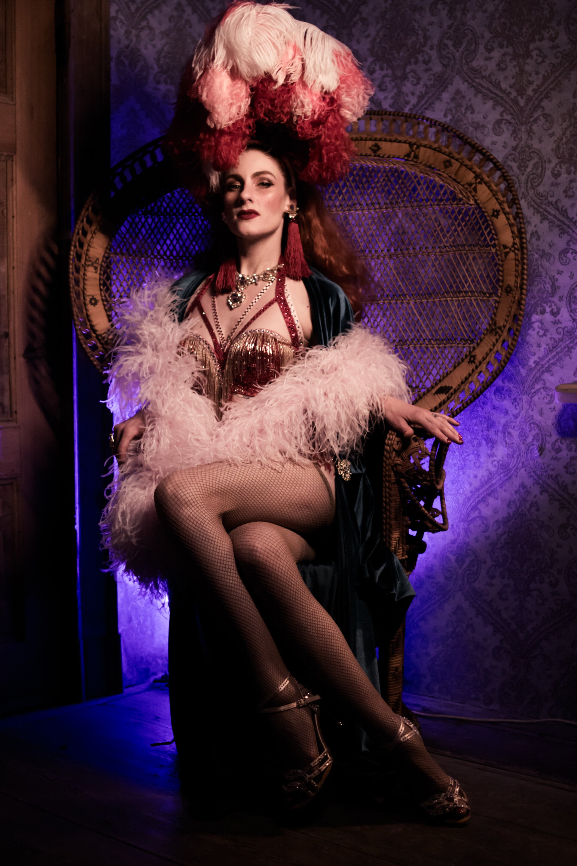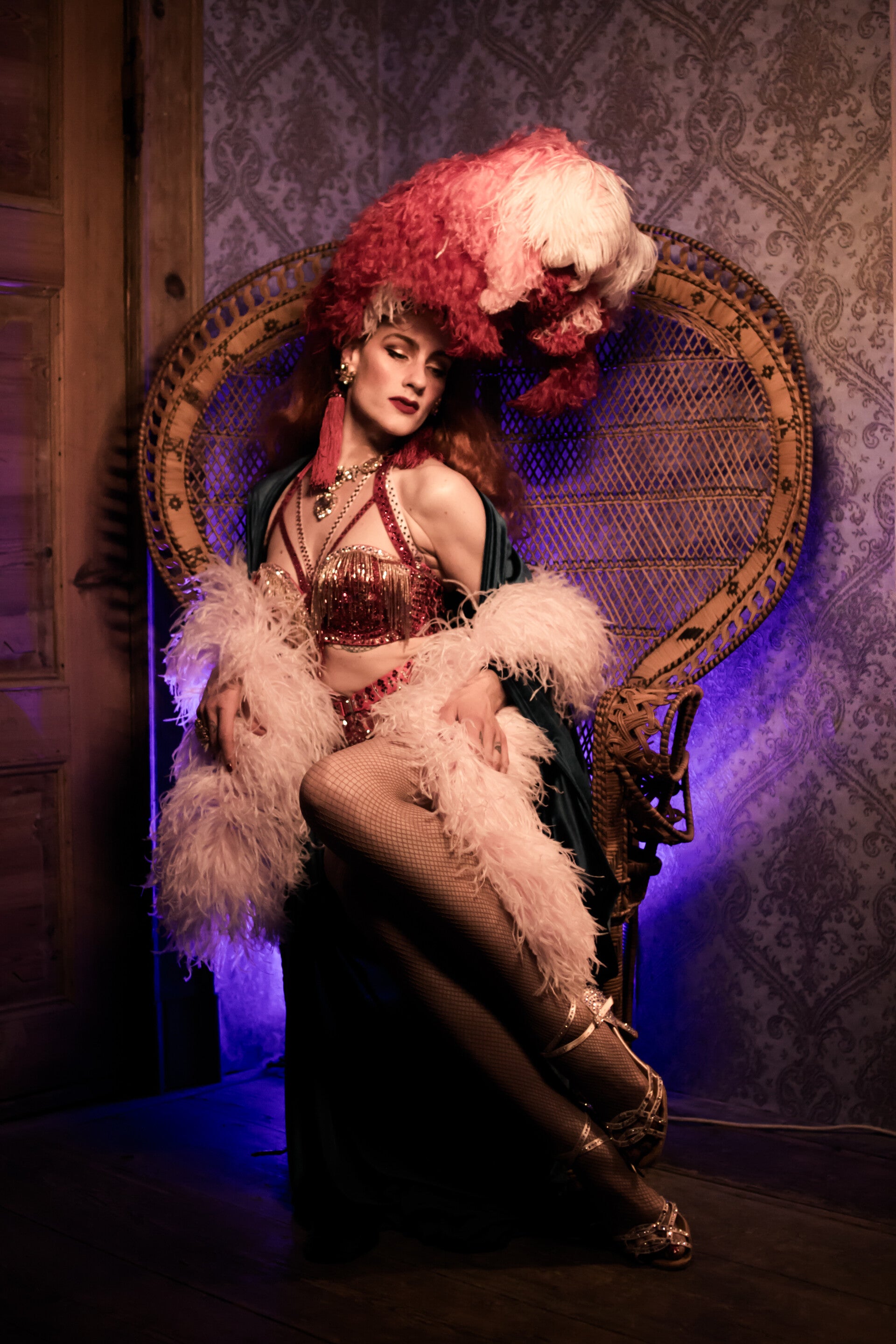 Mood: Vintage Showgirl, Cover Girl, The ultimate Glamour, High-Class Elegance, Dazzling Exquisite Costume, Lady in Red